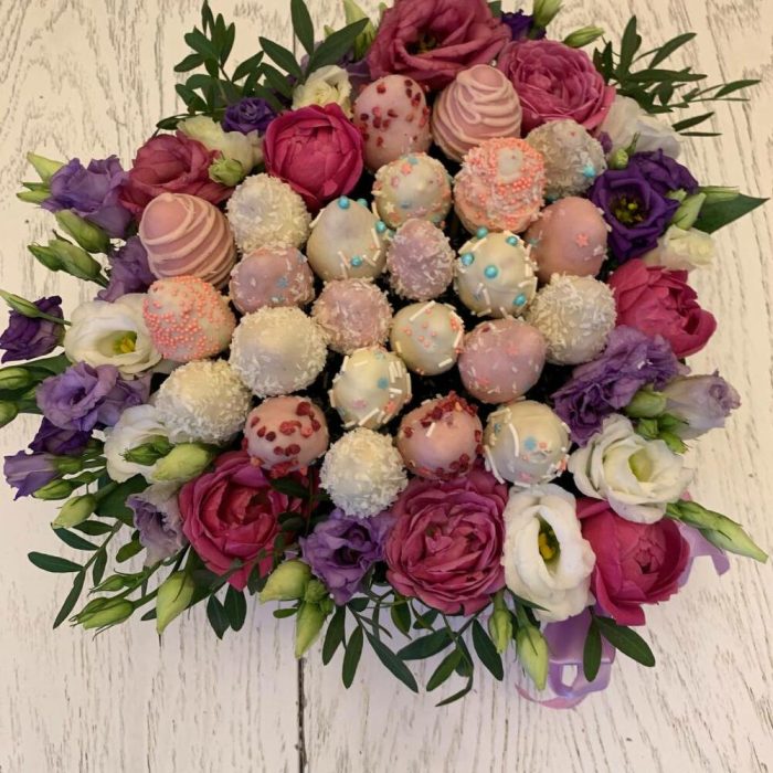 “Атлас☁️” – цветочная композиция с зефиром в деревянном ящике
