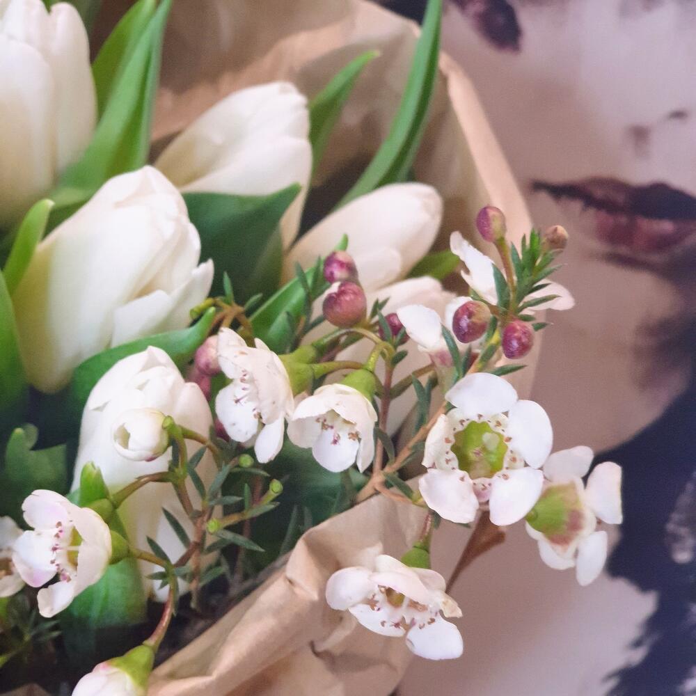 Лента атласная – 1 шт.Открыточка с вашими пожеланиями – 1 шт.Ваксфлауэр белый – 2 шт.тюльпаны белые – 15 шт.любовь флориста (бесплатно) – 1 шт.крафт жатая бумага – 1 шт.